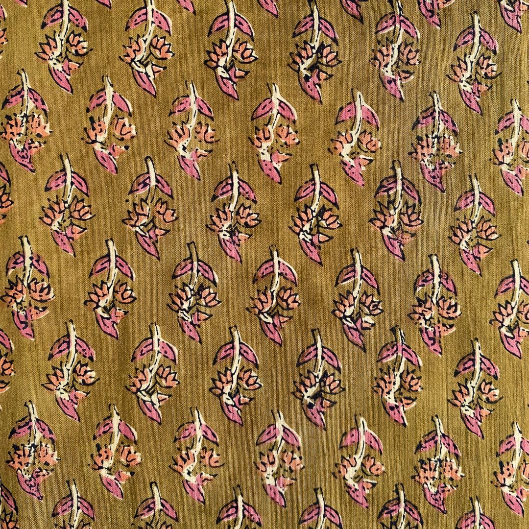This block-printed cotton voile features a lightweight, breathable structure with a crisp drape, suitable for making garments such as airy bottoms, blouses, or dresses. The design includes an all over small floral motif in shades of pink on a brown base.