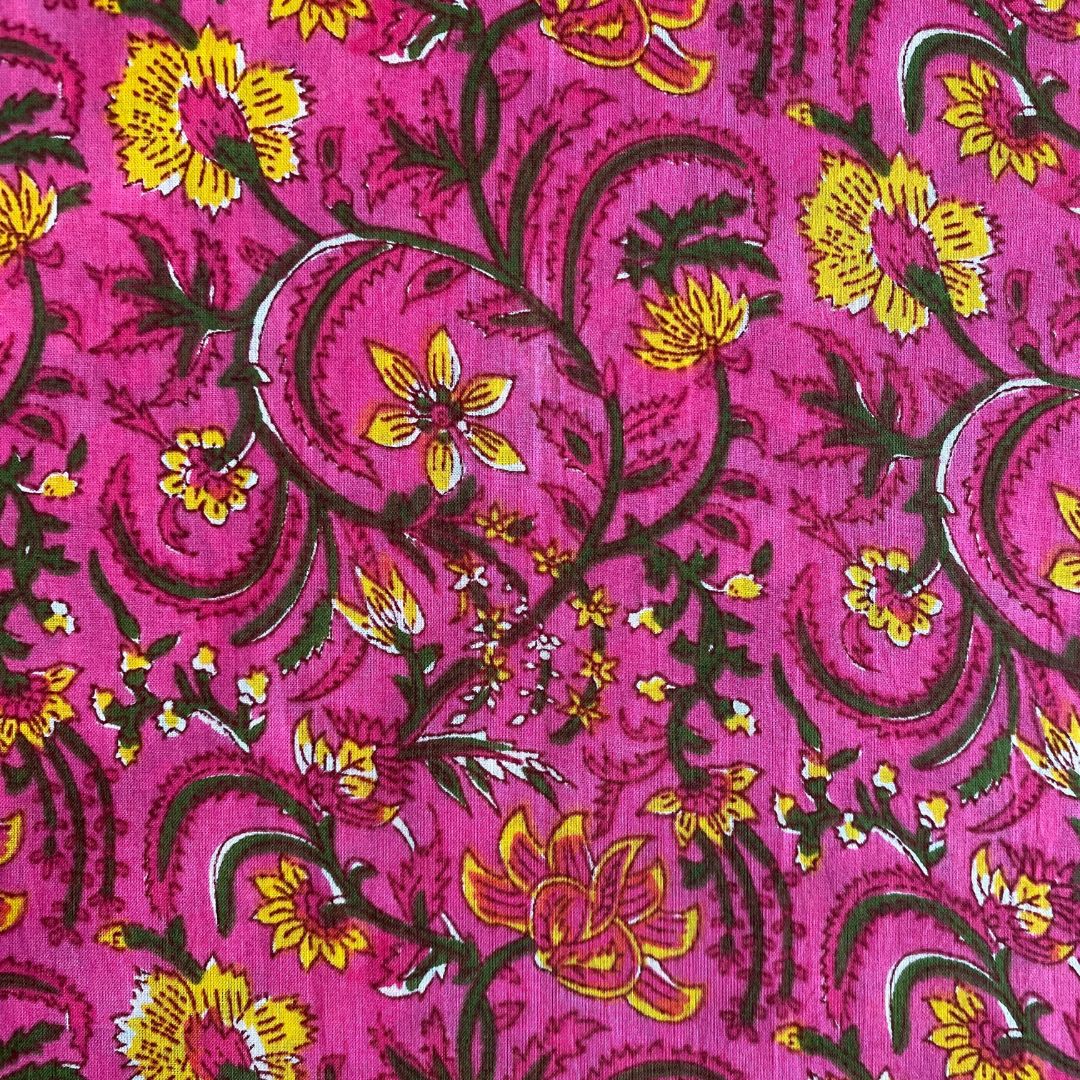 This block-printed cotton voile features a lightweight, breathable structure with a crisp drape, suitable for making garments such as airy bottoms, blouses, or dresses. The design includes large floral motifs in shades of green and yellow on a vibrant pink base.