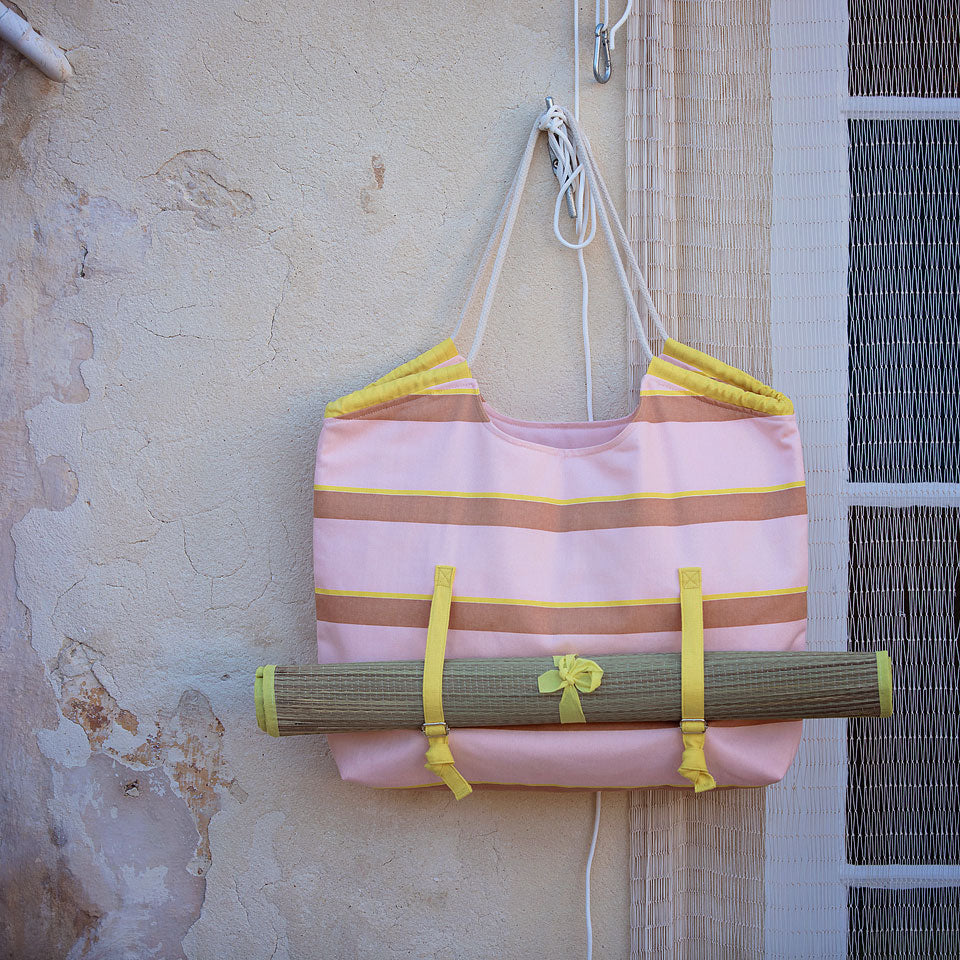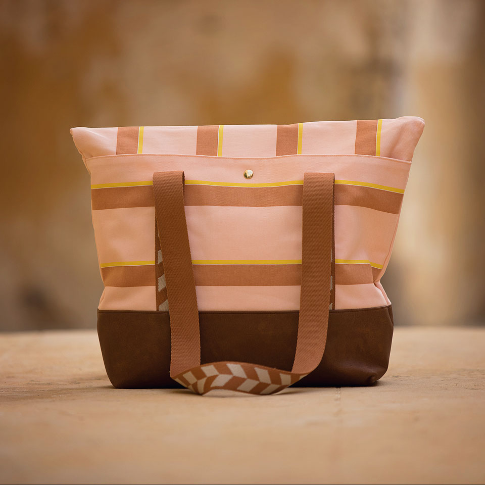 Cotton canvas gabardine twill fabric in pearl blush with lines in brown and yellow by European brand See you at Six. The height of the brown line is around 2.9cm. Gabardine is very durable material; the tight weave creates wrinkle and water resistance.