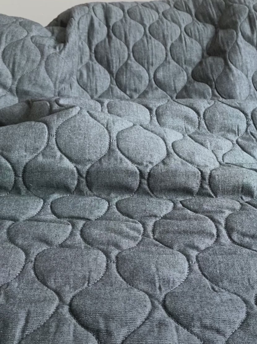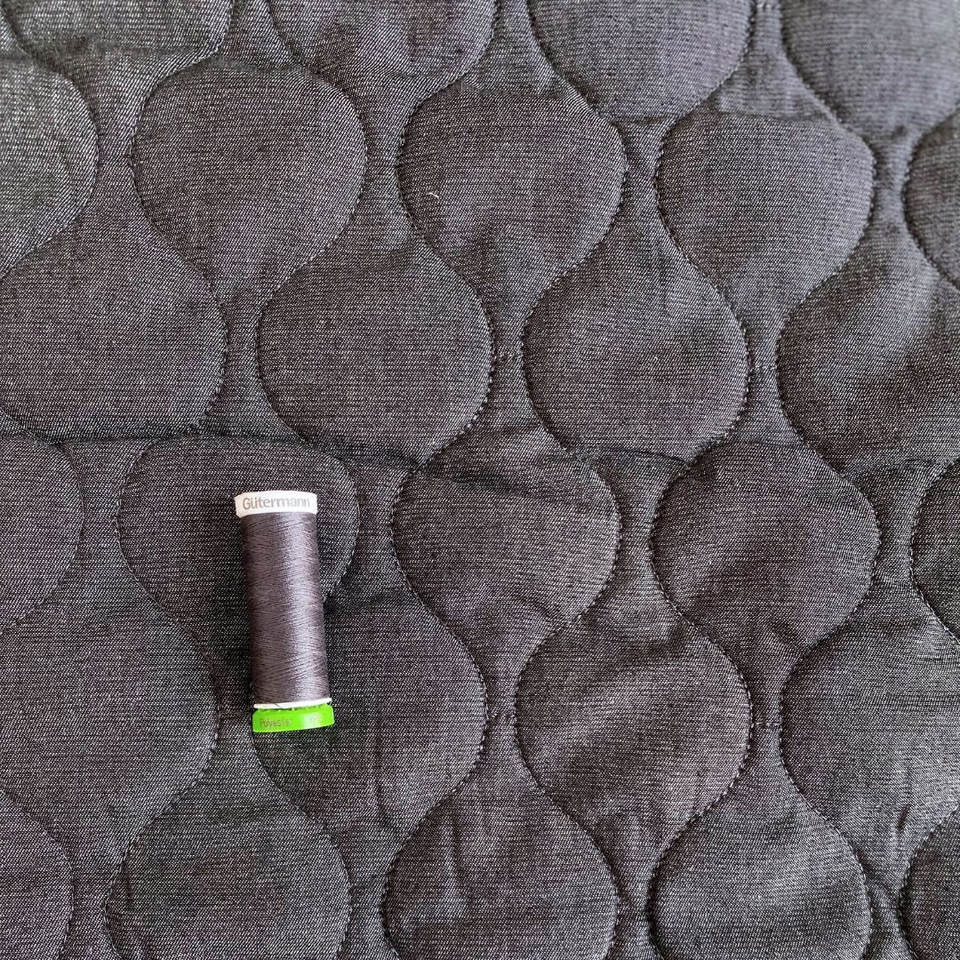 Quilted woven cotton chambray fabric in carbon black. This single sided soft and comfortable fabric features a wavy stitched design on a layer of cotton backed with a light thermal poly wadding for warmth and texture. Ideal for coats, jackets, gilets/body warmers, pet clothing and more.