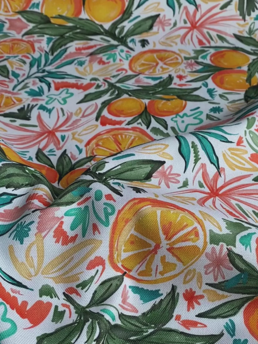 This vibrant print features citrus grove and fruit orchard motifs, capturing the summer mood with all the colours of a tropical sun holiday. With its versatile weight, it's ideal for sewing casual bottoms like skirts and shorts, while its sturdy structure means you can also create playful accessories like bags or totes. Beach bag and matching sun hat? Yes please!