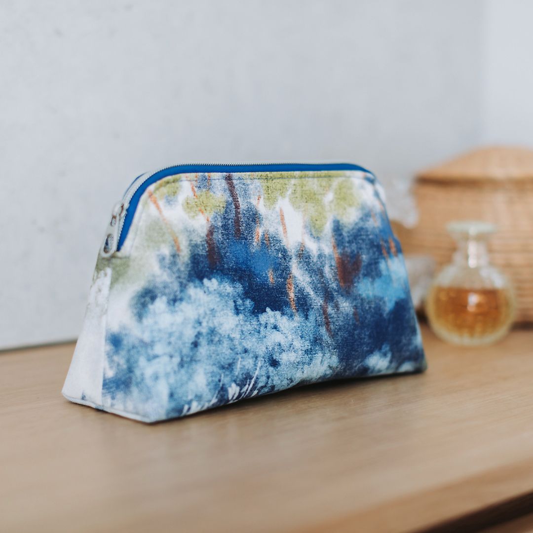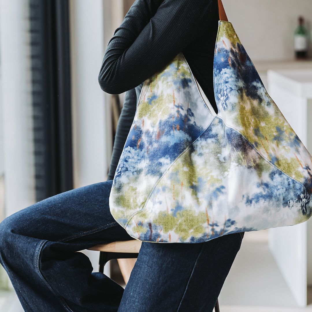 This gabardine is a cross-twill weave fabric in grey featuring an all over abstract strokes print in shades of steel blue. It's very durable, with a tight weave that creates wrinkle and water resistance. At around 9oz, it's perfect for bottom weight and jeans patterns, along with casual jackets and accessories like totes and bags!