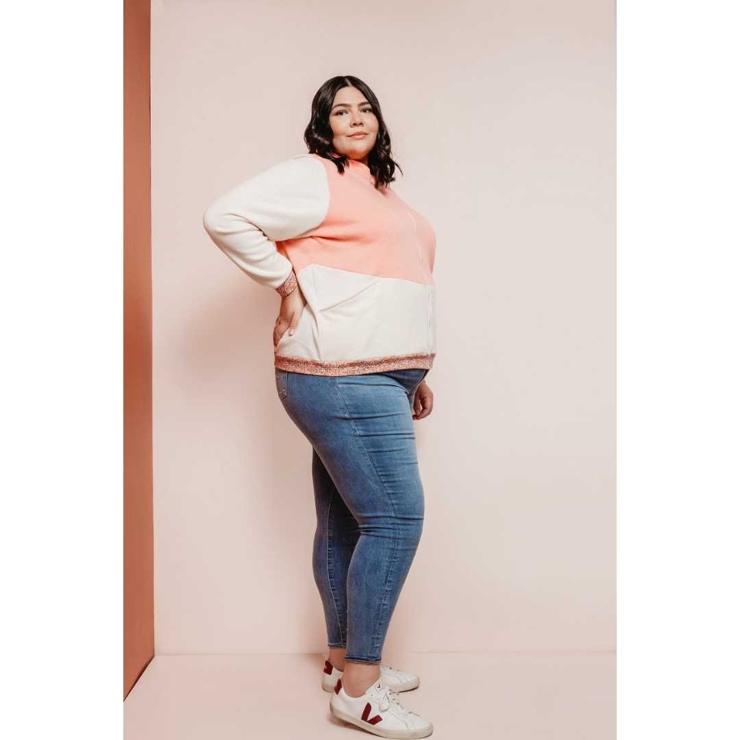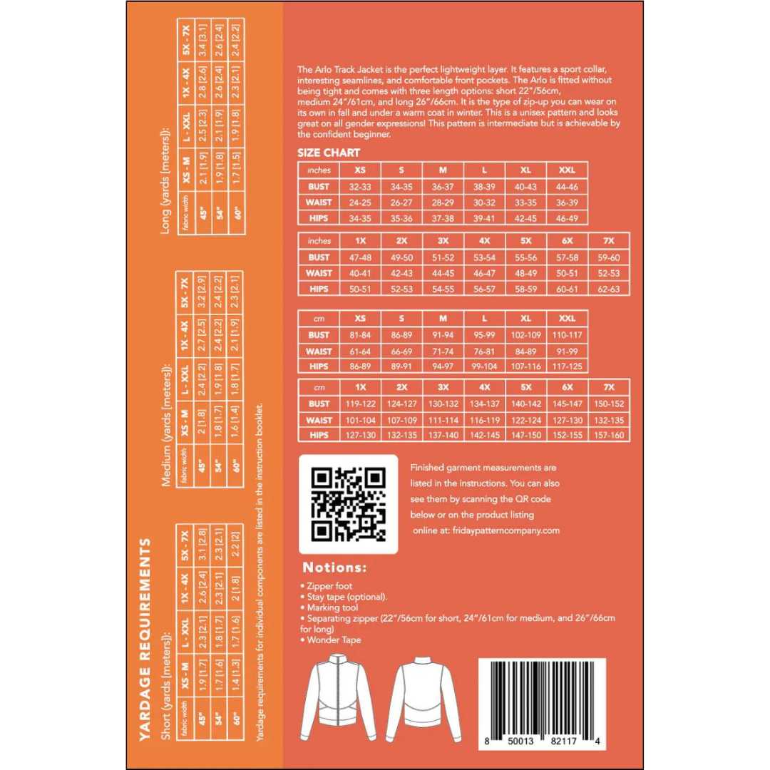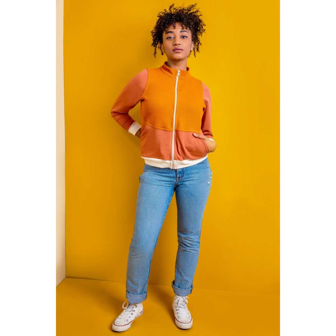 Unisex Arlo Track Jacket sewing pattern from Friday Pattern Company. The Arlo Track Jacket is the perfect lightweight layer. It features a sport collar, interesting seamlines, and comfortable front pockets. The Arlo is fitted without being tight and comes with three length options: short 22”/56cm, medium 24”/61cm, and long 26”/66cm. It is the type of zip-up you can wear on its own in autumn and under a warm coat in winter. This is a unisex pattern and looks great on all gender expressions! This pattern is intermediate but is achievable by the confident beginner.