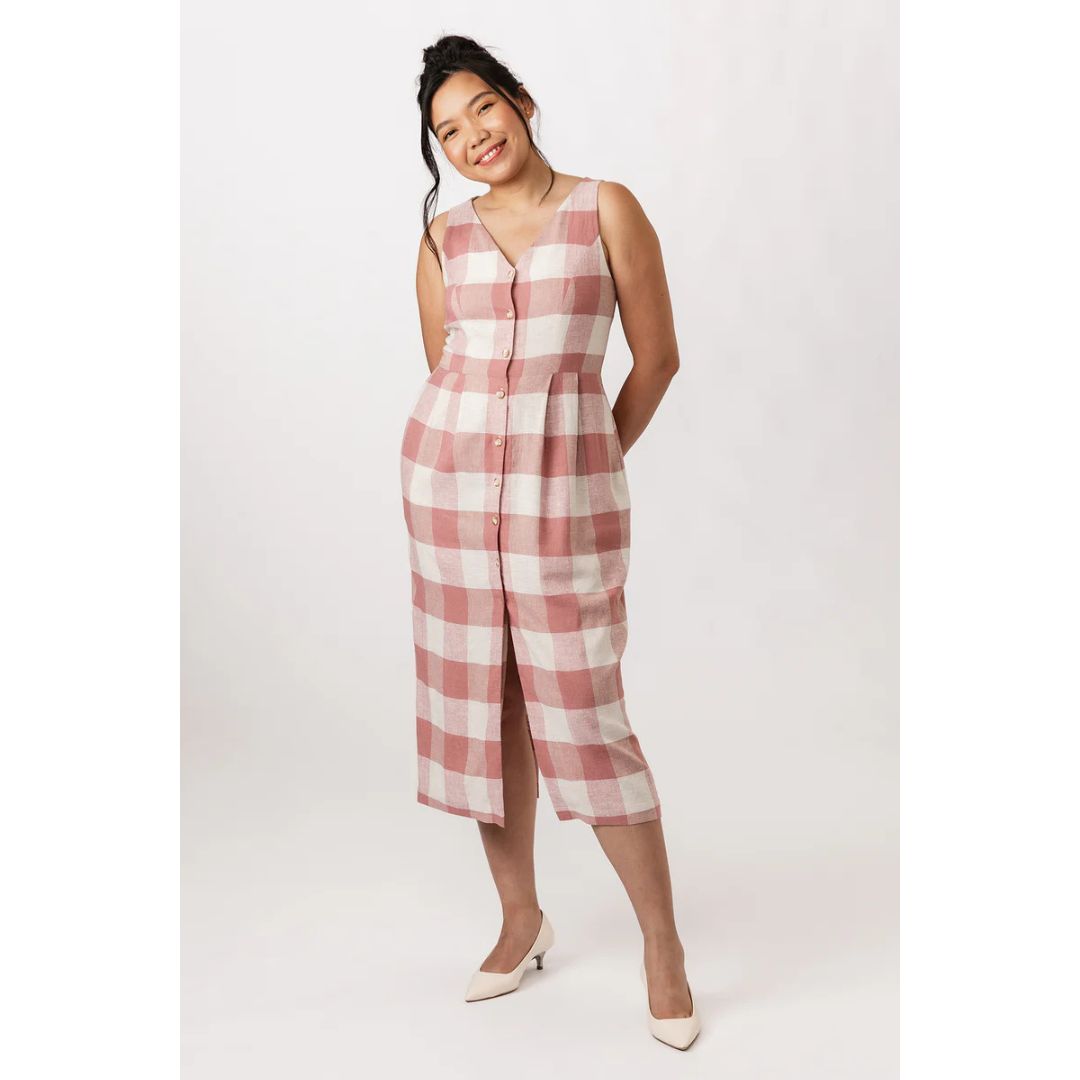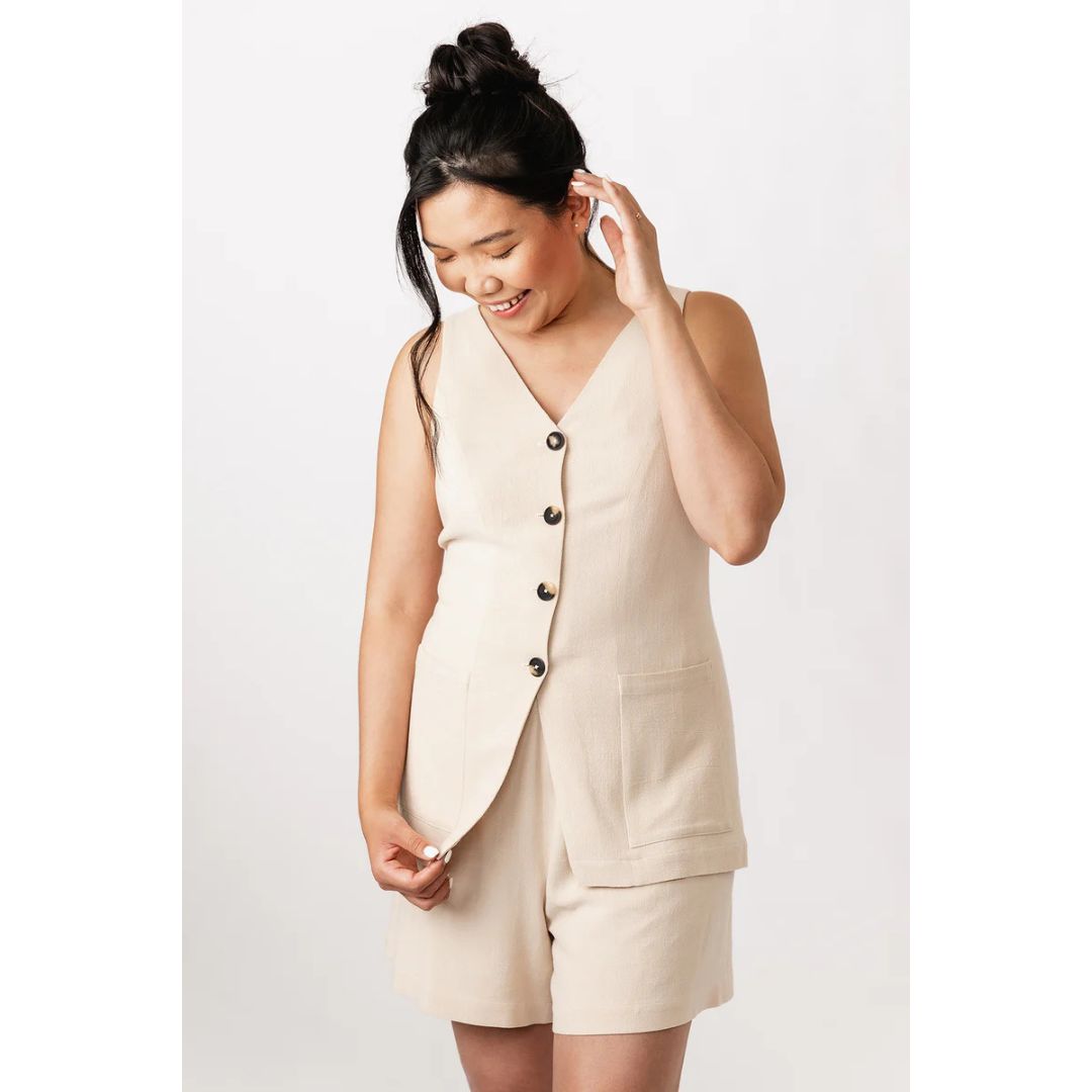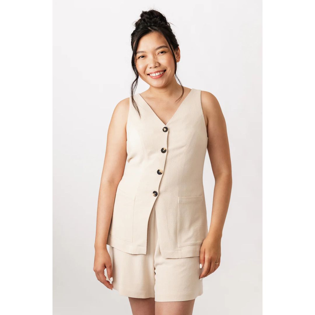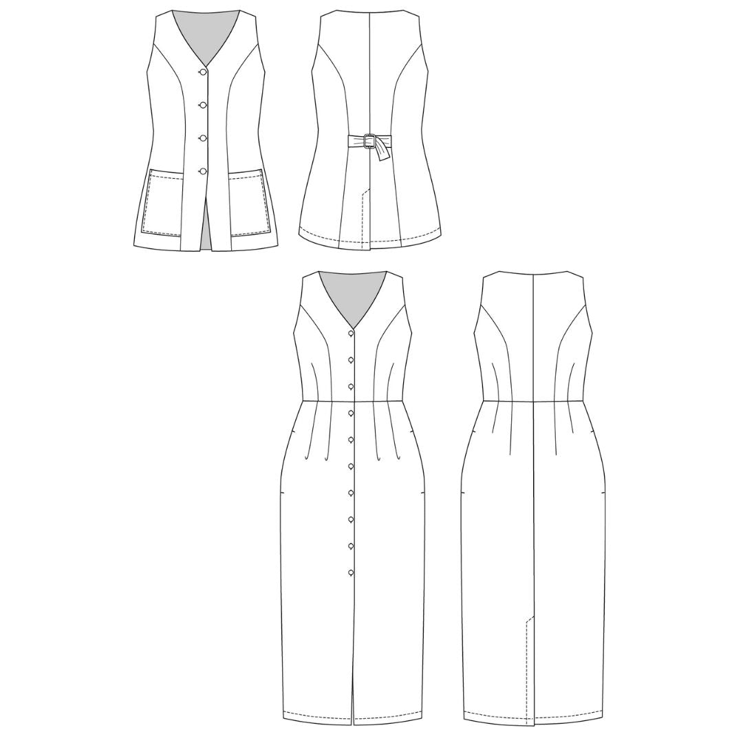 The Asteri sewing pattern includes two options: an elegant sleeveless midi dress, and a stylish vest top. Both variations are unlined, and feature a princess cut, V-neck, and buttoning at the front. The dress has discreet in-seam side pockets, and the vest comes with distinctive patch pockets on the hips. The waist pleats give a nice volume to the pencil skirt of the dress, while the split back hem ensures comfort. The vest includes buckled tab at the back waist for adjusting ease.