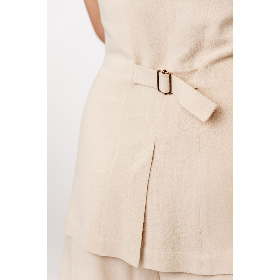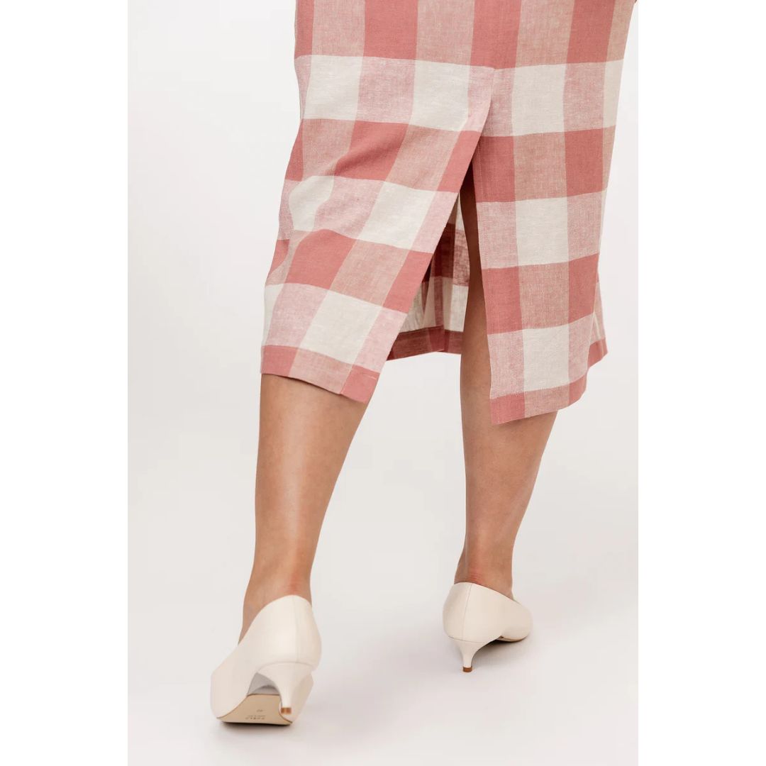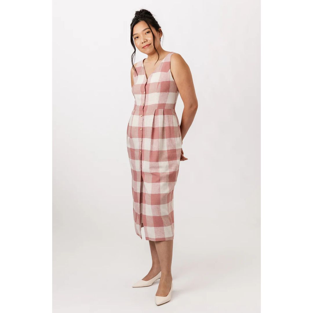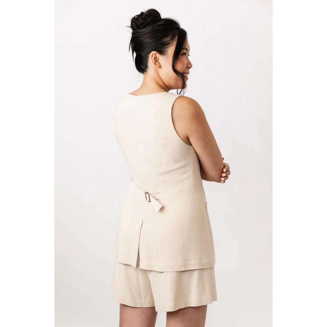 The Asteri sewing pattern includes two options: an elegant sleeveless midi dress, and a stylish vest top. Both variations are unlined, and feature a princess cut, V-neck, and buttoning at the front. The dress has discreet in-seam side pockets, and the vest comes with distinctive patch pockets on the hips. The waist pleats give a nice volume to the pencil skirt of the dress, while the split back hem ensures comfort. The vest includes buckled tab at the back waist for adjusting ease.