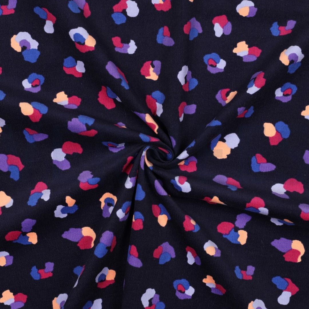 Soft and light, fine needlecord corduroy fabric featuring a fun animal skin print in shades of purple, fuchsia and blue on navy base. Ideal for making pinafores, overalls, jackets, overshirts, skirts, and accessories. The possibilities are endless, the choice is yours!