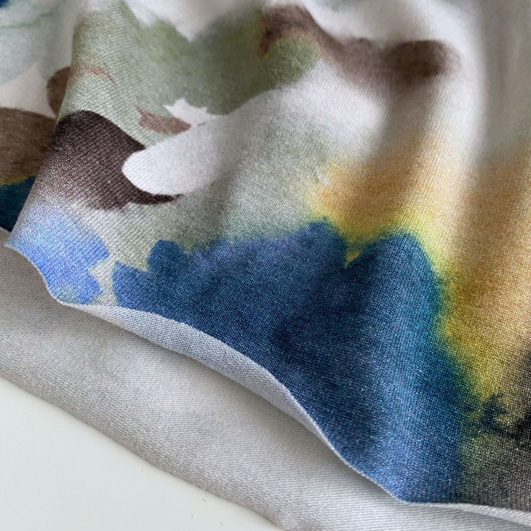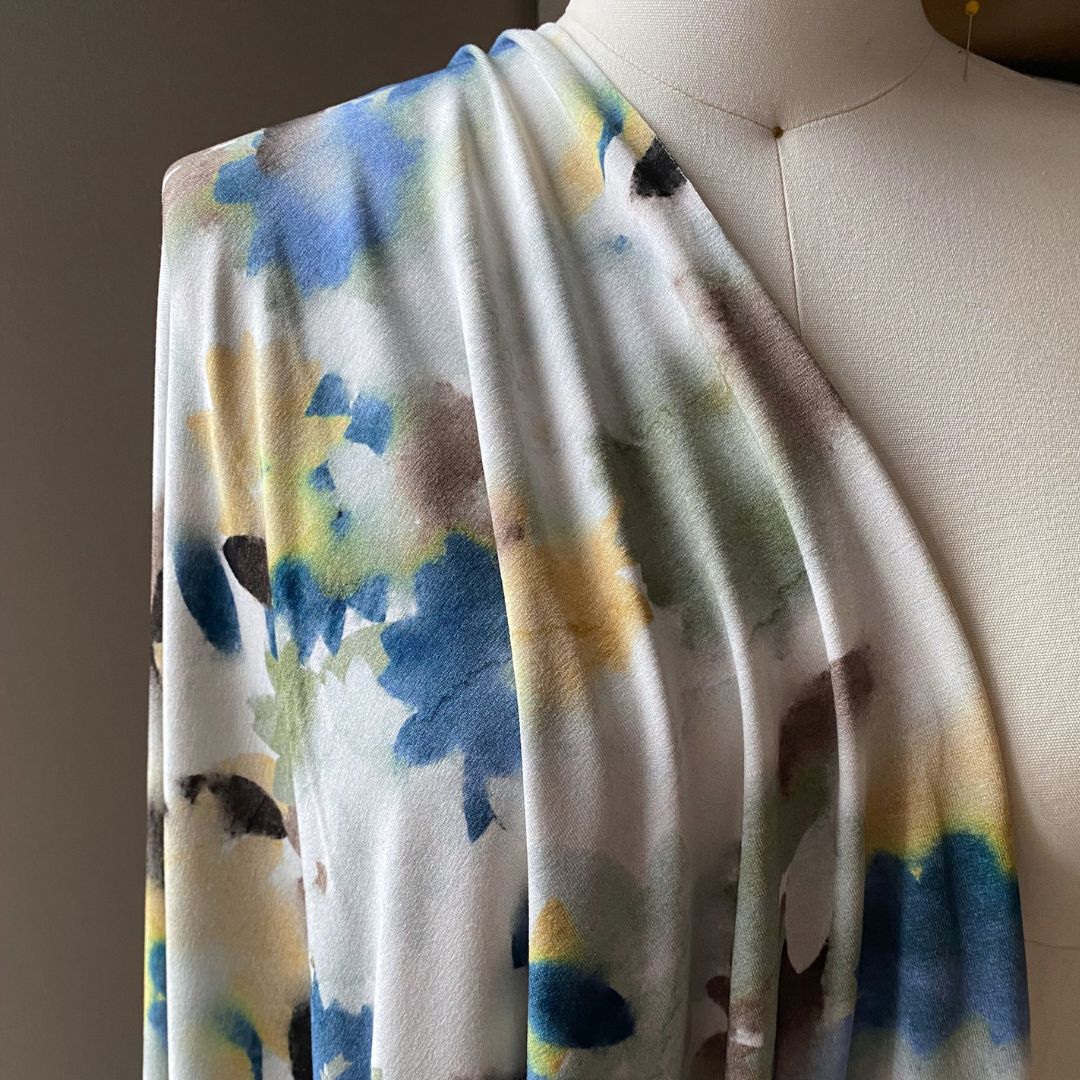 This ultra soft, medium weight bamboo lycra jersey knit features a watercolour style digital print in shades of denim blue and sage on cream background. It offers a generous 4-way stretch for added comfort and ease. The high bamboo content gives this fabric a luxurious feel and a smooth flowing drape. It is perfect for stylish tops, dresses, loungewear and t-shirts.