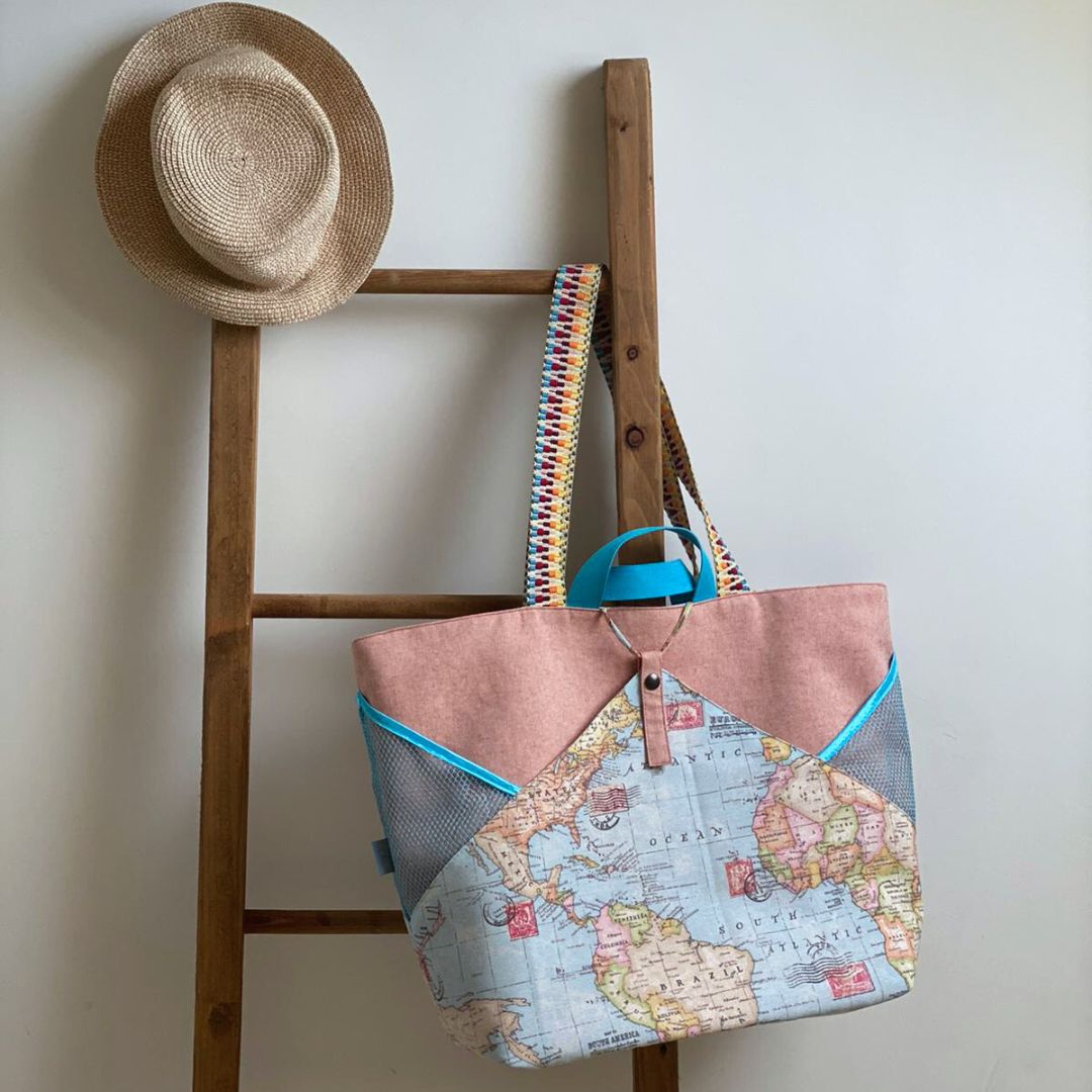 Pictured is the APEXcarry bag by In Complete Stitches. We have paired the world map canvas with our recycled canvas in rust.
