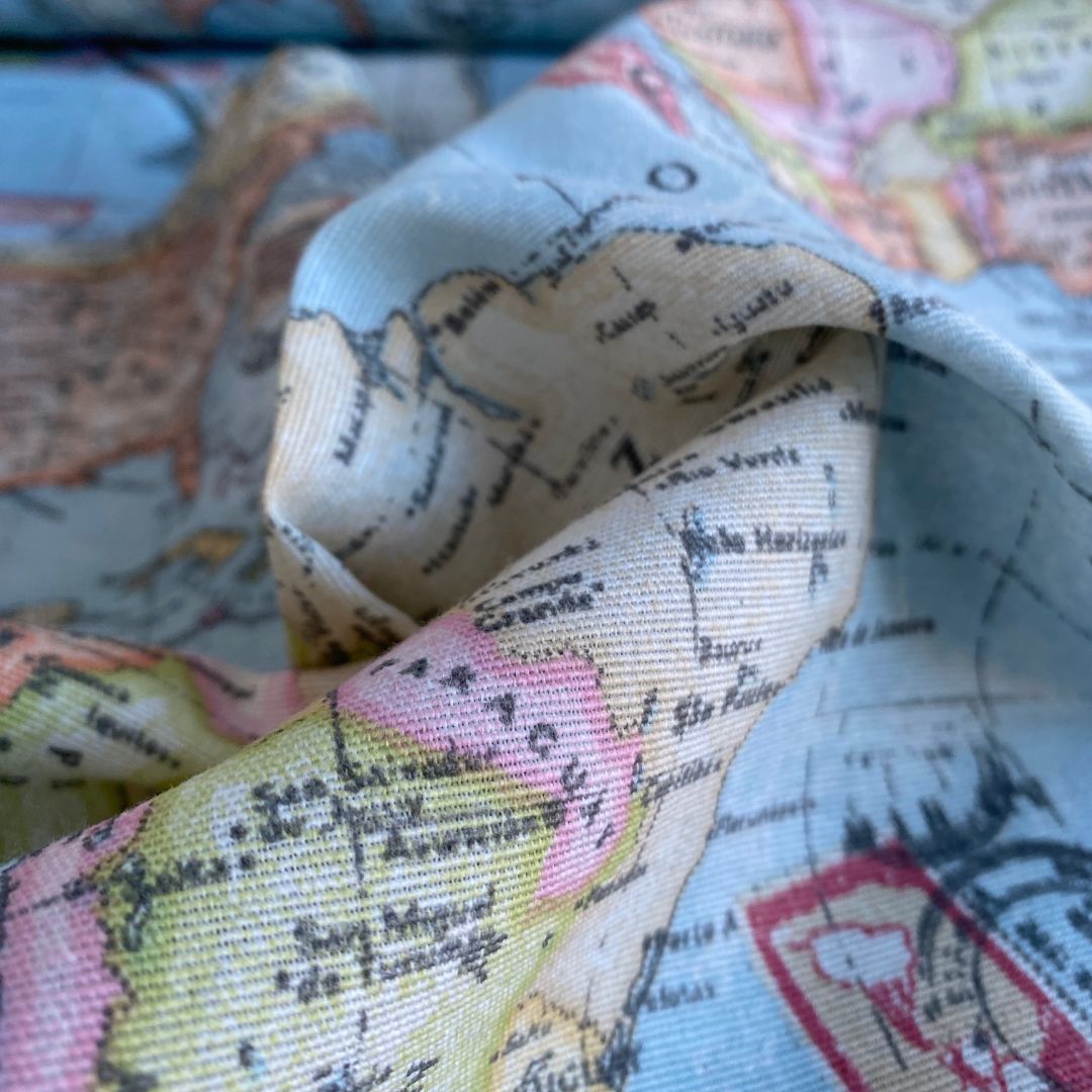 Cotton blend canvas fabric with a world map print. Great medium weight material suitable for accessories, bag making etc.