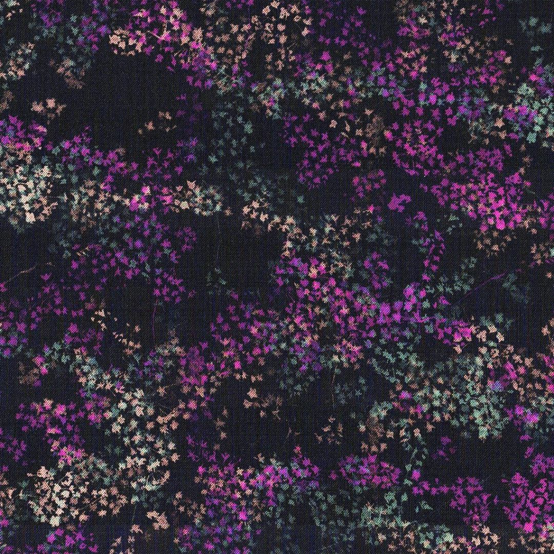 This soft and fluid viscose fabric features purple, green and beige stars scattered across a black background in a cosmos like manner. Inspired by a clear night sky where the stars are in full view. This fabric is perfect for lightweight dresses, blouses, skirts, or shirts.