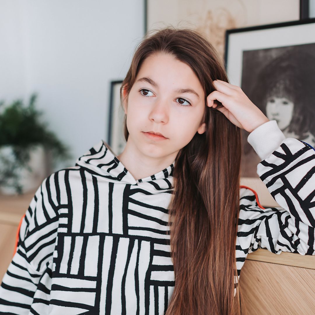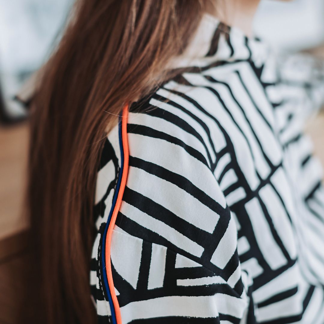 This french terry is a knitted fabric having a soft hand and which stretches well in horizontal and vertical direction. It features all over lines print in black on tofu beige beige background. With its smooth face and looped back, this terry fabric is perfect for creating loungewear, hoodies, jackets, sweaters, joggings.