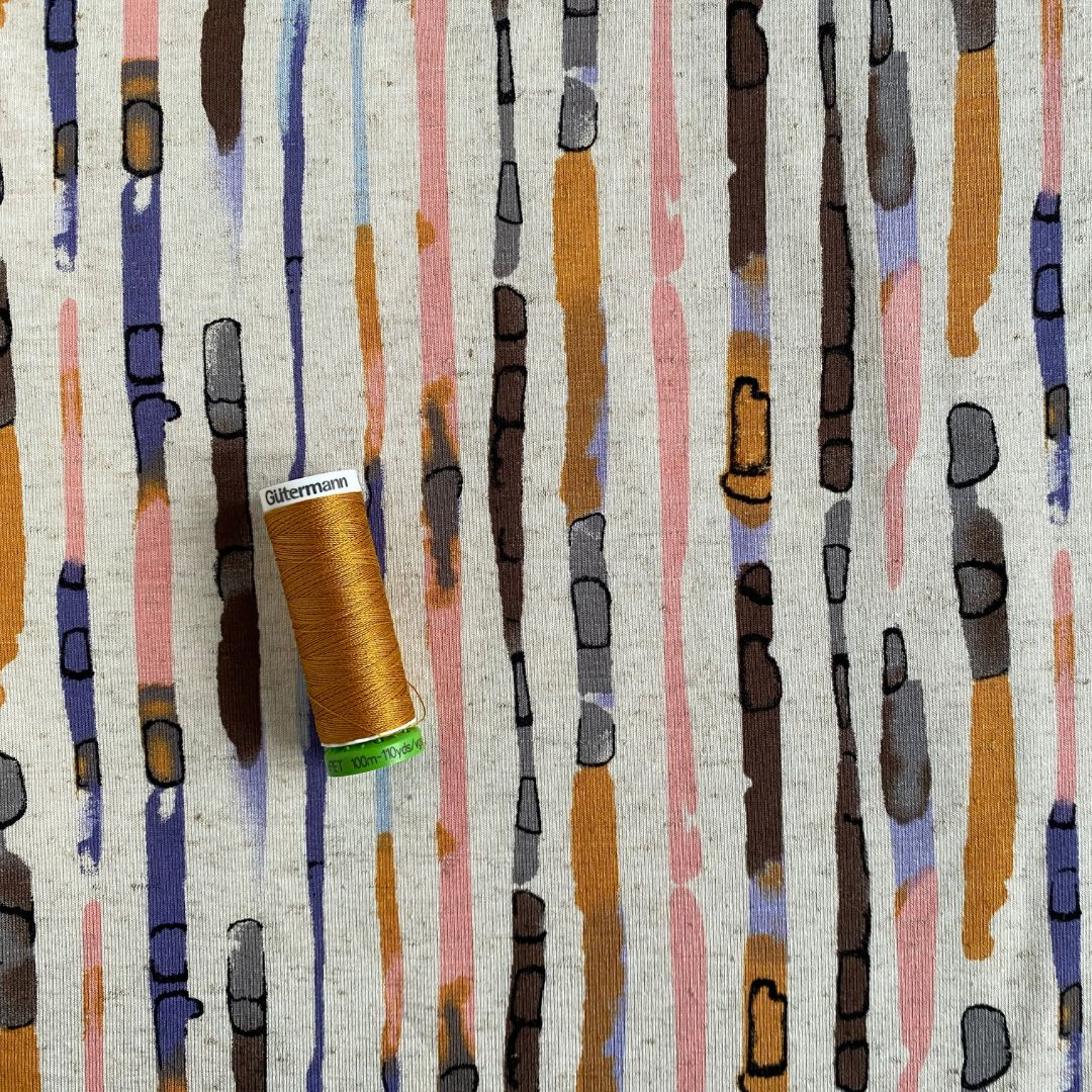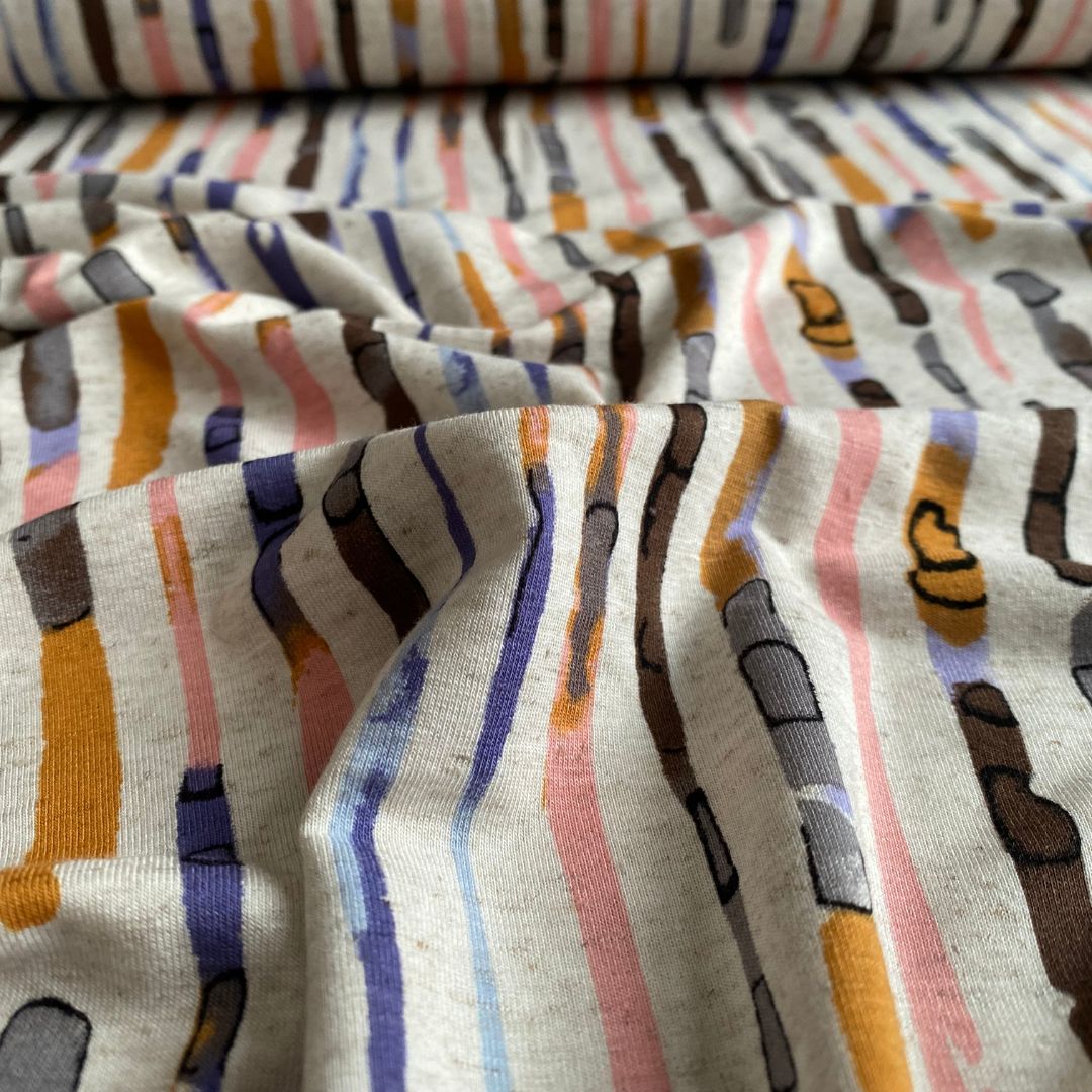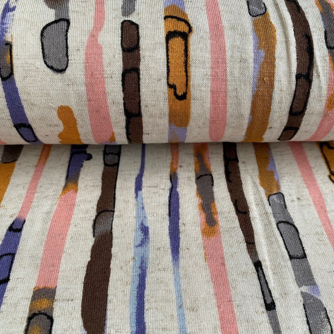 Light and flowing viscose linen blend jersey with beautiful soft drape. Features a striking abstract vertical stripes print in shades of pink, purple, ochre, brown, black and grey on ecru mottled background. This fabric is ideal for sewing simple dresses, tops and, t-shirts, etc.