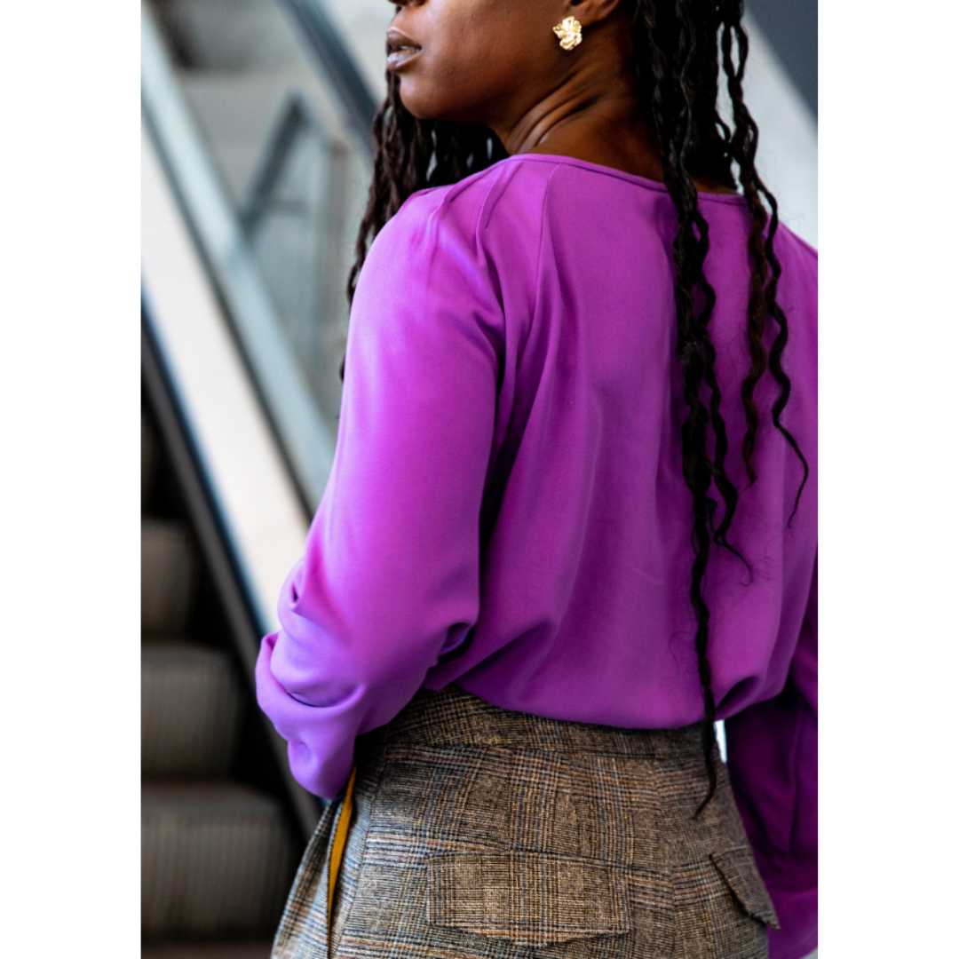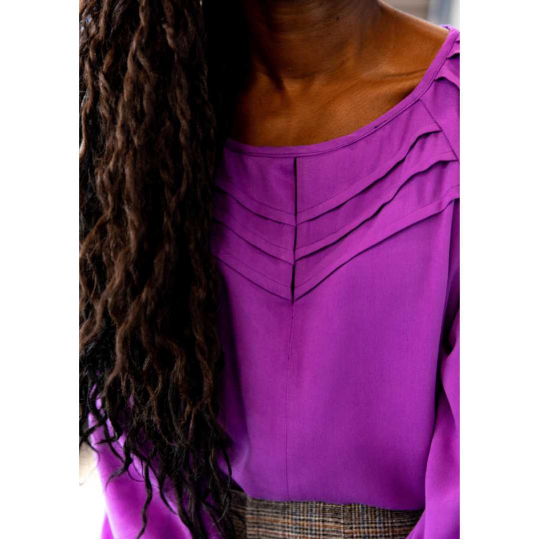 The Chelsea blouse boasts lots of interesting details such as pretty raglan sleeves and pleats. Choose between several finishes: pleated front or not, gathered and buttoned bottom sleeve or sleeve strap, to vary the difficulty and play with your fabrics and your patterns. As beautiful worn over or tucked into pants, its cut is slightly fitted, for a structured, feminine and comfortable look.