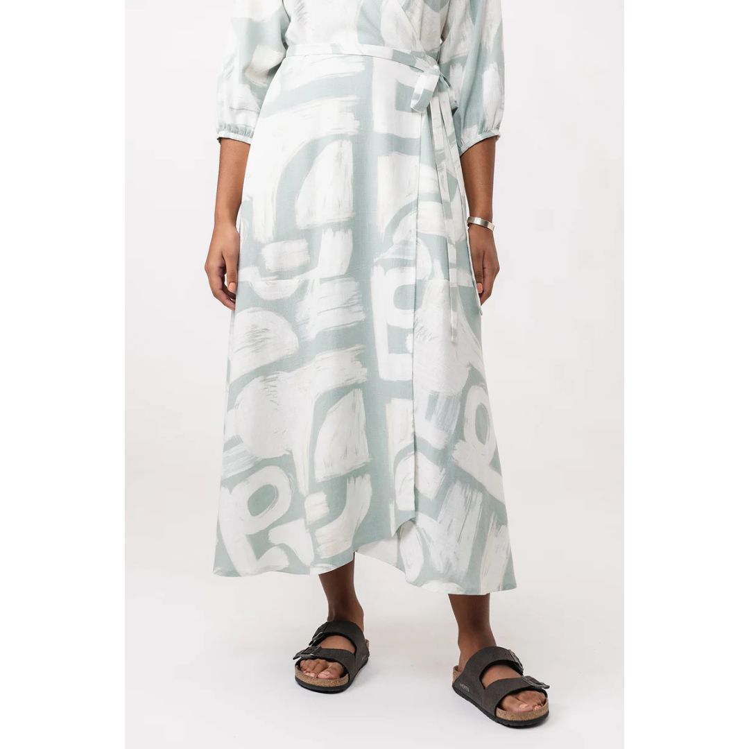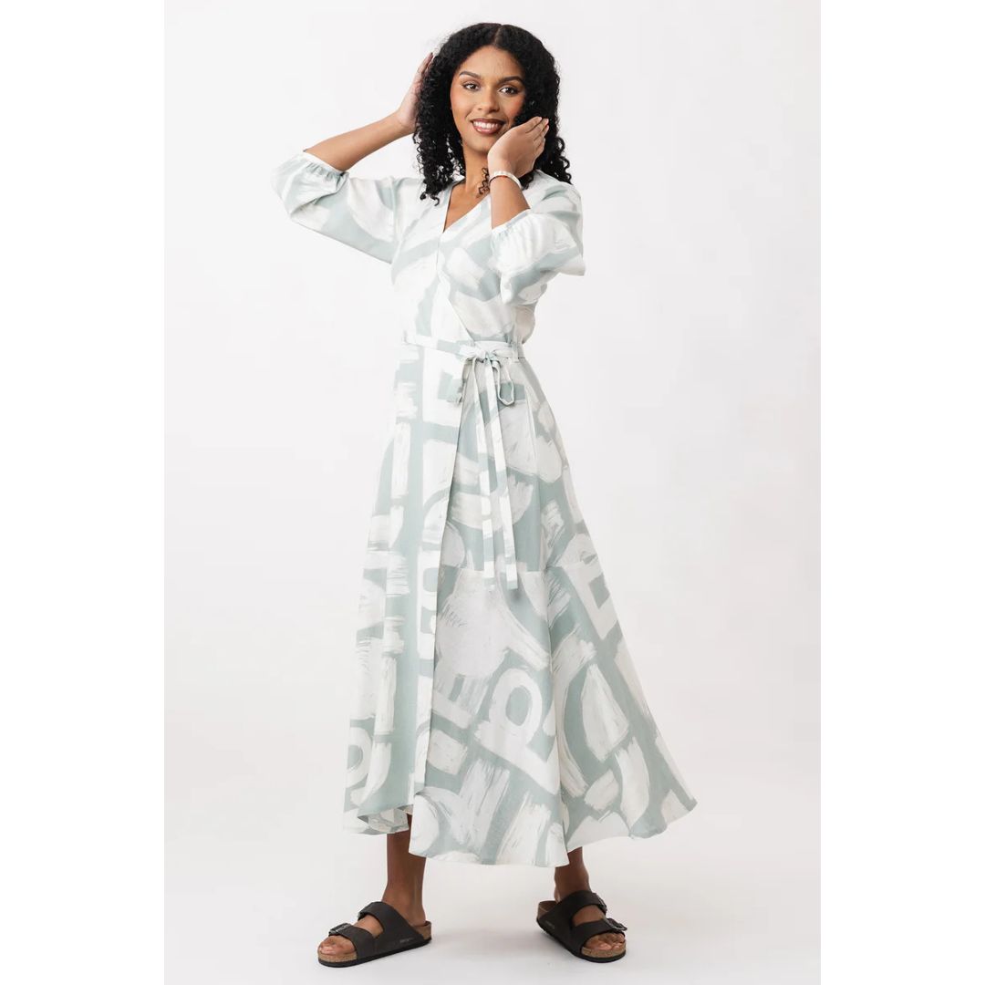 Hali wrap dress is a comfy and stylish wardrobe staple. The garment features a semi-fitted wrap bodice with a back yoke and a V-neck, wrap tie closure and handy side pockets. The dress has a voluminous, ankle-length circle skirt and ¾-sleeves with gathered sleeve openings.