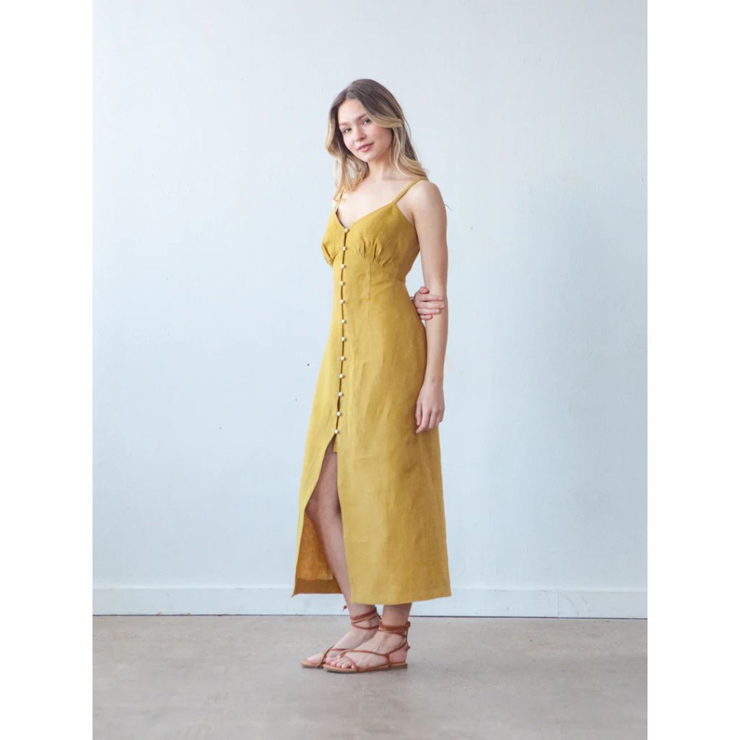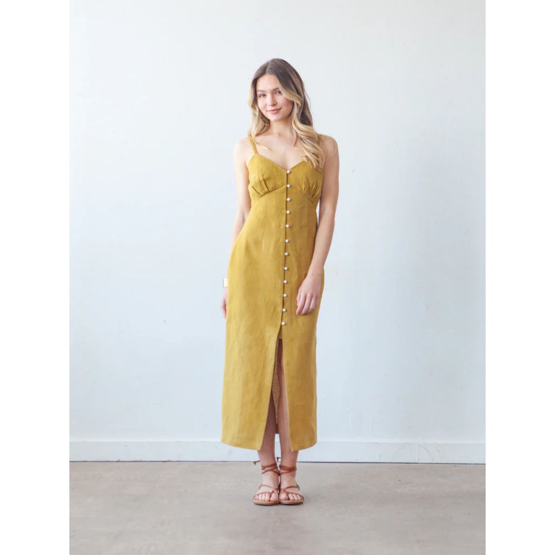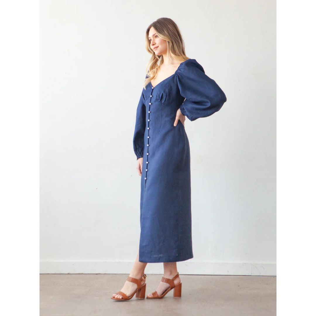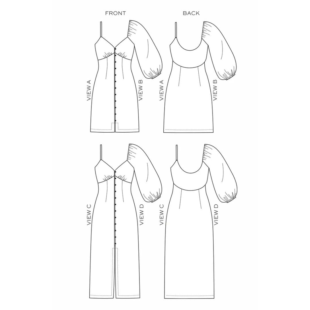 The Lora pattern is an empire waist dress with four views. All views have underbust gathers, a self-lined bodice, and twelve loop buttons along the center front. Views A and C have half-inch spaghetti straps at the shoulders while Views B and D have long puff sleeves. The dress is fitted through the waist and hips and has a straight fit through the skirt with Views A and B ending just above the knee and Views C and D hemmed a couple inches above the ankle.