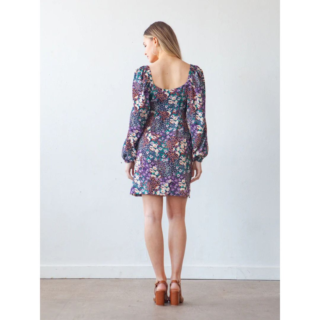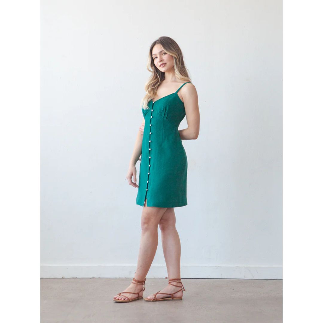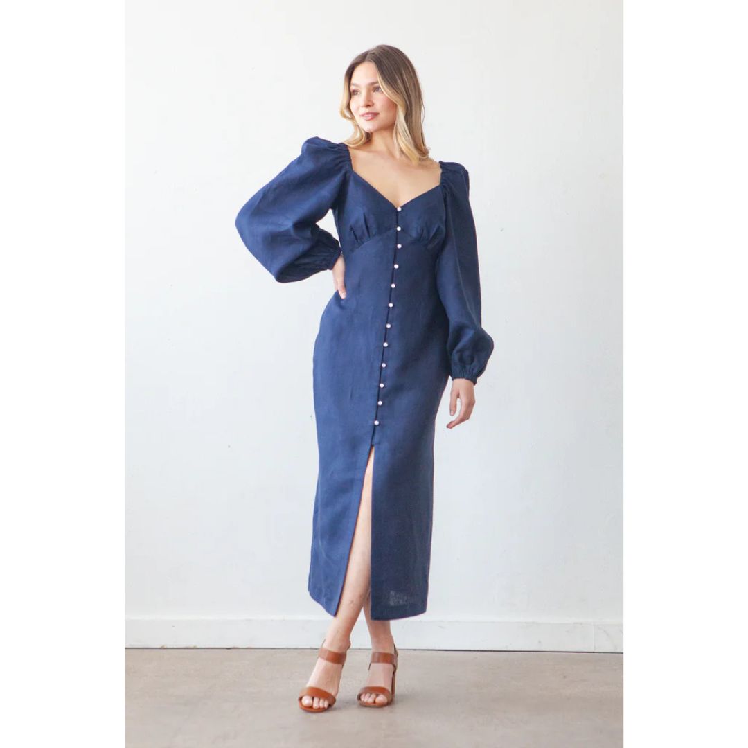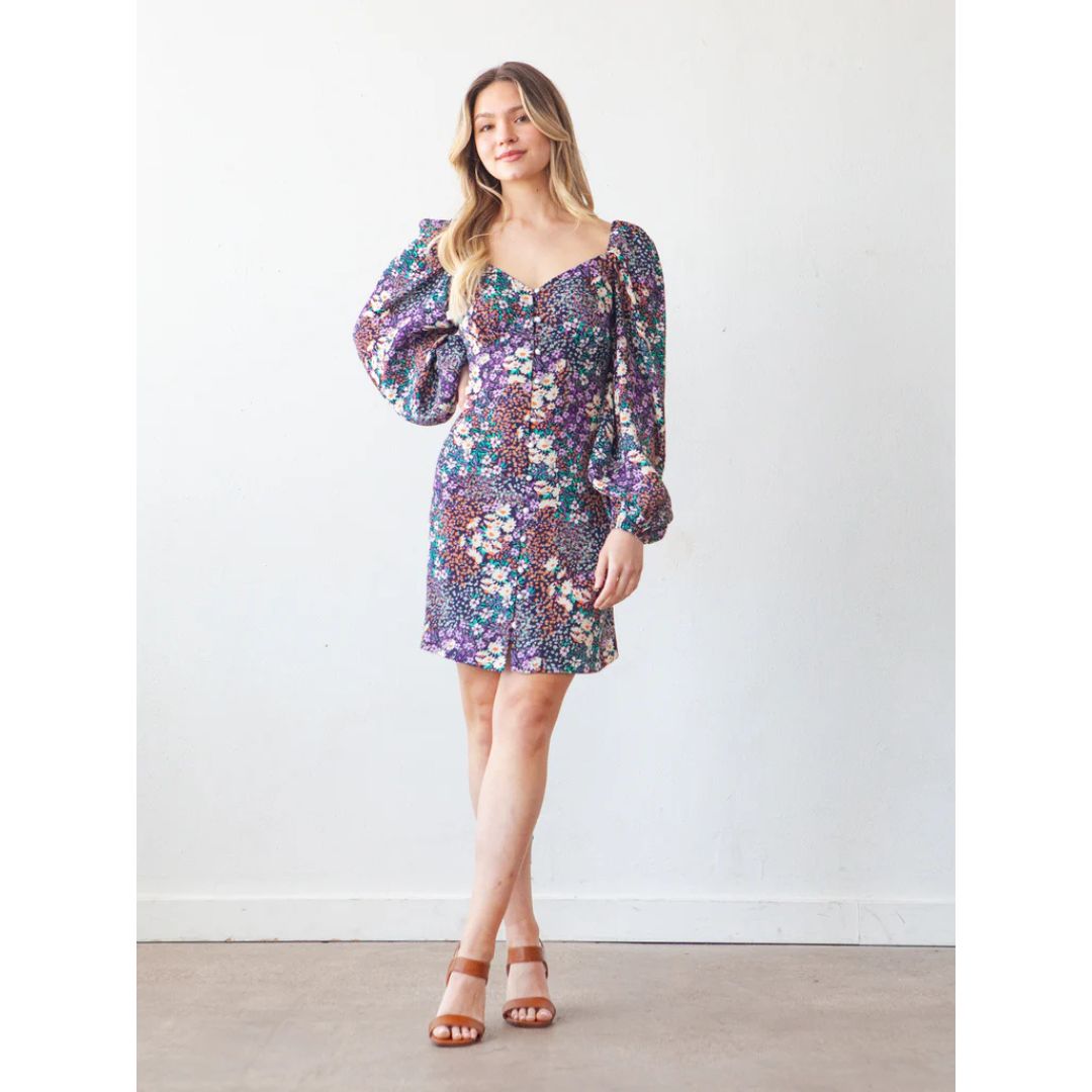 The Lora pattern is an empire waist dress with four views. All views have underbust gathers, a self-lined bodice, and twelve loop buttons along the center front. Views A and C have half-inch spaghetti straps at the shoulders while Views B and D have long puff sleeves. The dress is fitted through the waist and hips and has a straight fit through the skirt with Views A and B ending just above the knee and Views C and D hemmed a couple inches above the ankle.
