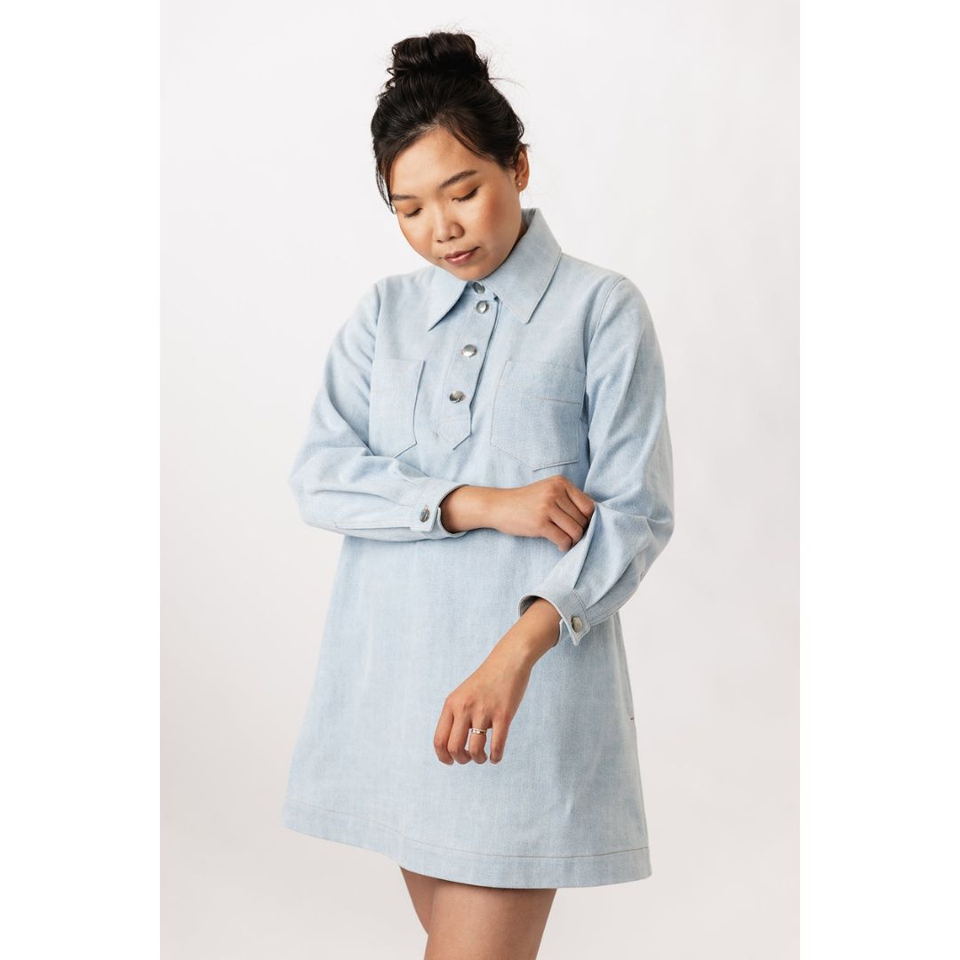 Loviisa is a modern and urban a-line mini jeans dress sewing pattern. The large collar, chunky button placket, and angular chest pockets make this classic style more edgy. The dress also features handy side pockets and cuffed long sleeves. The pleats and slits on the cuffs add volume and lightness to the sleeves. The dress is decorated throughout with subtle topstitching.