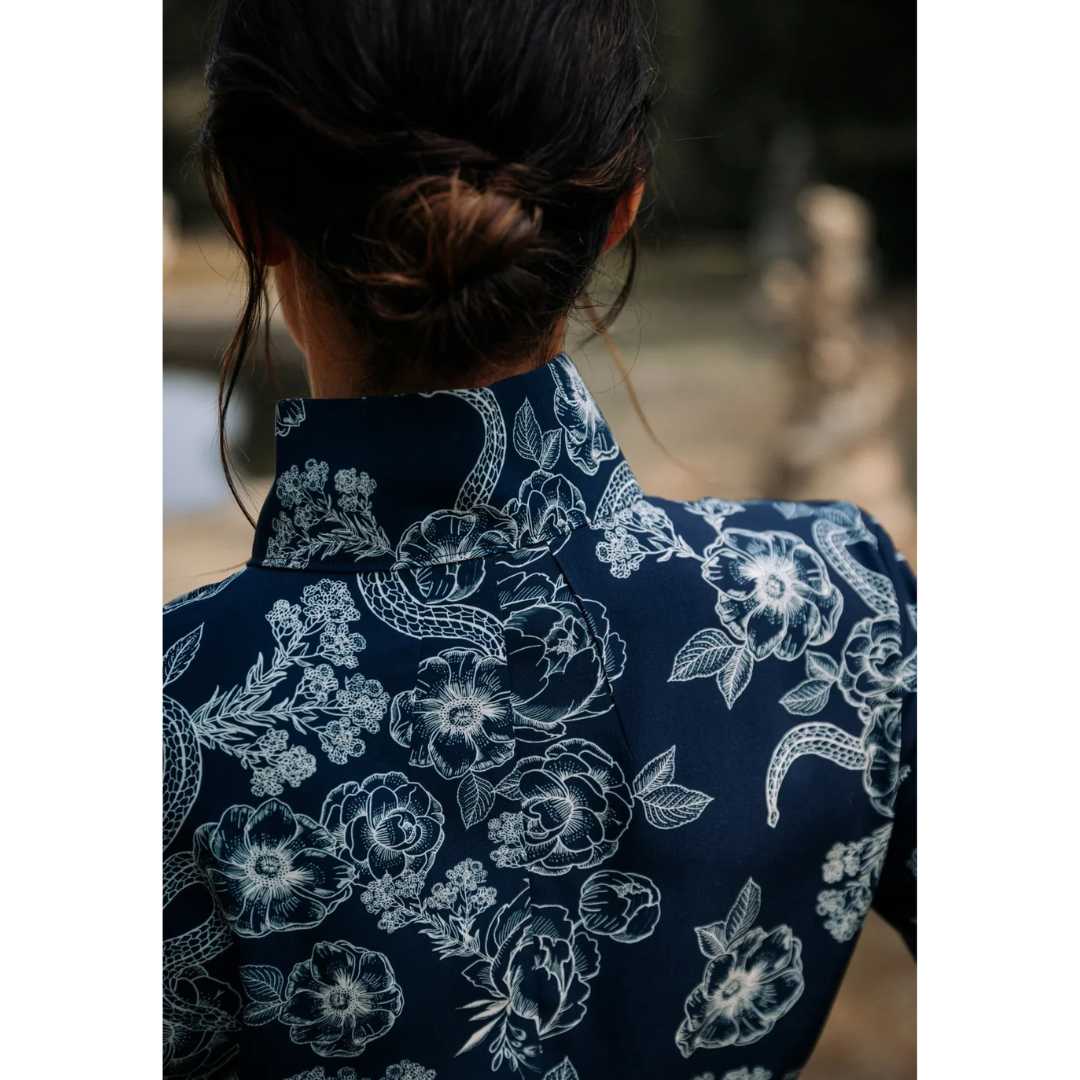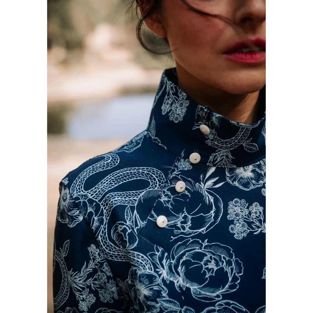 Discreetly elegant, a streamlined cut: beneath its apparent simplicity, the beautiful Soliflore dress has a very assertive look: its straight cut is supported by a belt, and the front slit on the side feminises and rejuvenates the silhouette. Its signature: play on pleats on the back neckline, and a large collar that elevates without constricting the neck so you can hold your head high, embellished by a button placket that allows it to be worn closed or open and folded down.