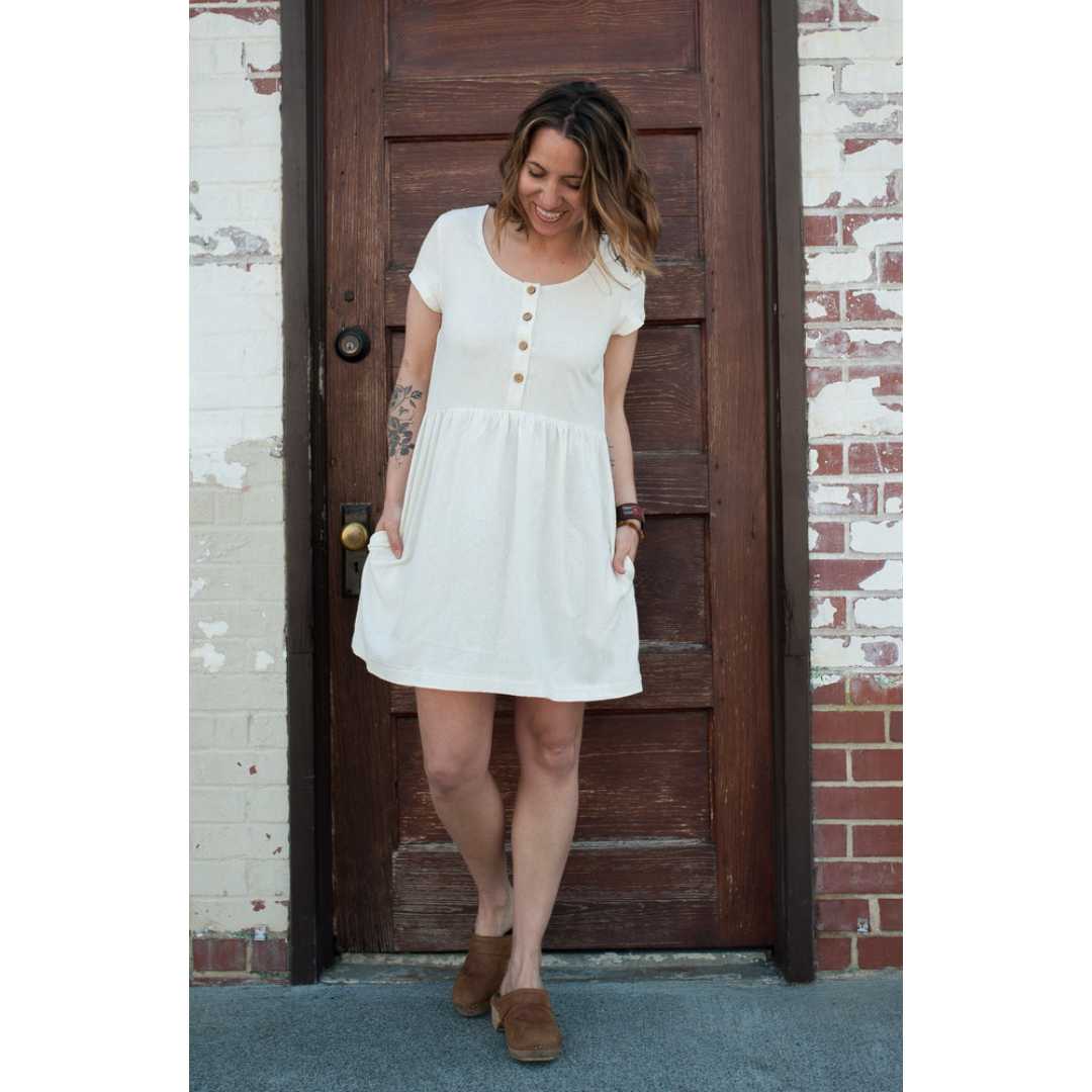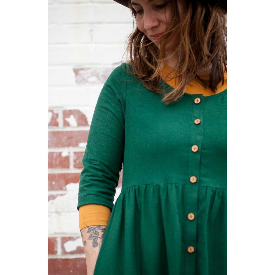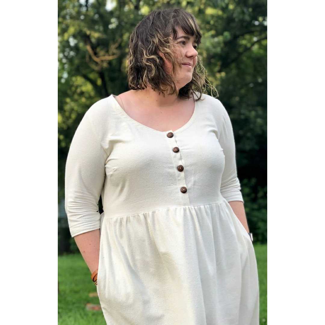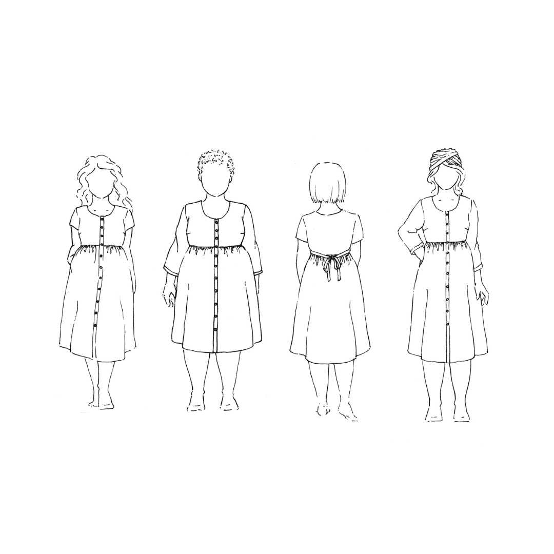 The Hinterland Dress offers a timeless, comfortable, and elegant silhouette. Featuring three sleeve options, either partial or full button down plackets, customisable length, and inseam pockets, this is a pattern workhorse that spans the seasons. The fit is loose, with side bust darts and a gathered skirt with optional waist ties, and is easily modified for maternity and nursing.