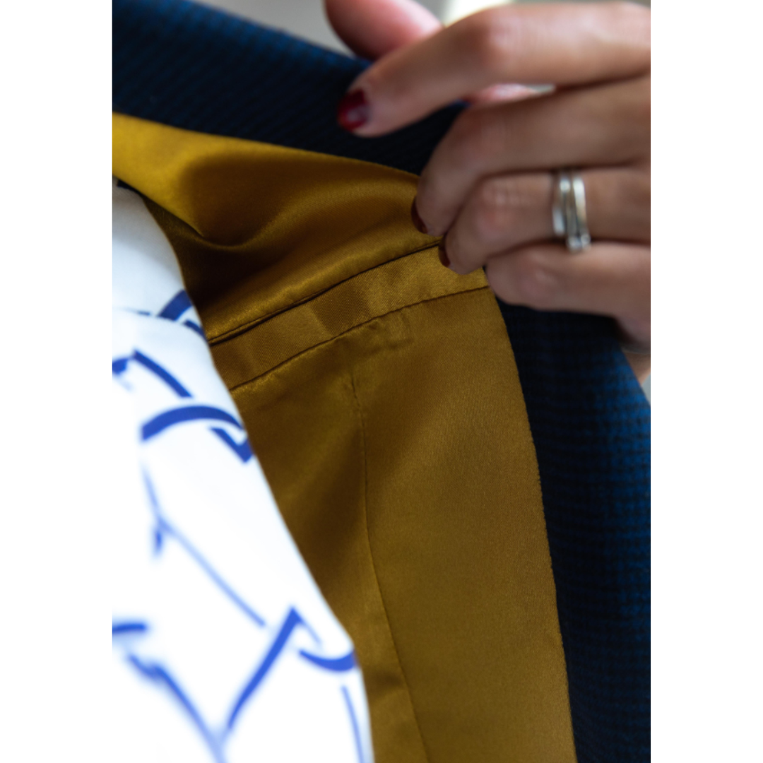 A light wool, fine tweed, Prince of Wales, velvet, soft fabrics between 150 and 300 g/m2. The jacket has a tight fit, we recommend a silky smooth lining material such as our Cupro lining, which is more breathable and an environmentally friendlier option than polyester.
