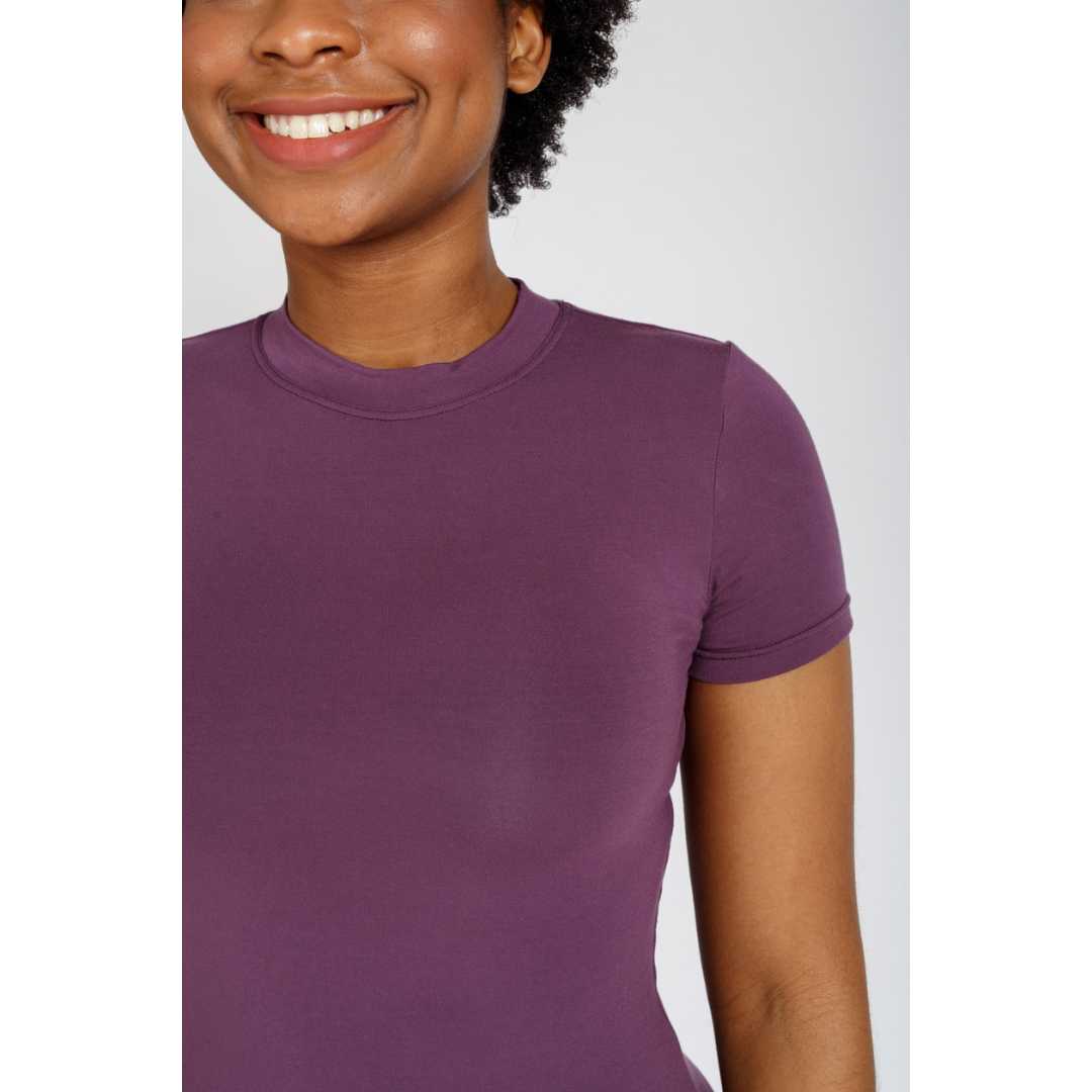 View A is a short sleeve tee with crew neckline. View B is a 3/4 sleeve tee with v neckline. View C is a long sleeve tee with turtle neck. View D is a short sleeve bodysuit with crew neckline. View E is a ¾ sleeve bodysuit with v neckline. View F is a turtleneck bodysuit with long sleeves.